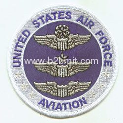 Embroidered patch- military, American air force- "UNITED AIR FORCE AVIATION", 85% embroidery, blue twill, silver metallic thread, merrowed border.