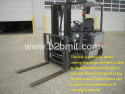 The fork is movable.When raising the cargo,the fork is able to be adjusted forward right or left with the control shaft at the narrow space , This function can improve the convenience of moving in and out.