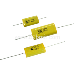 Polyester film dielectric with vacuum-evaporated metal electrodes, axial leads of tinned wire are electrically welded to the contact metal layer on the ends of capacitor winding out wrapped with Mylar type and ends sealed with epoxy resin.