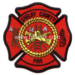 Embroidered emblem- fire, "SHELBY COUNTY FIRE", 70%, red twill, black stitched and heat-cut border.